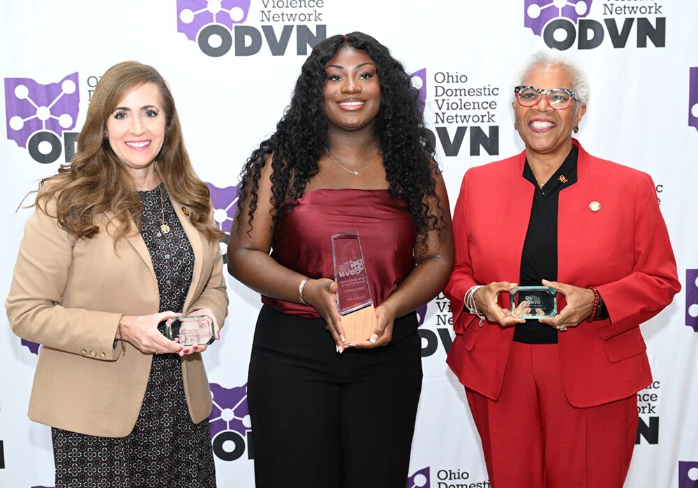 ODVN honored domestic violence survivor Kar’mell Triplett with the Croucher Family Award for Outstanding Leadership during its annual Domestic Violence Awareness Month event in the Capitol Atrium on Oct. 7. Kar’mell, was a victim of tech-assisted abuse, and her advocacy was instrumental in the push for SB 100, a bill making it illegal to place an electronic device on someone’s property without their permission. An Akron police officer found an air tag under her car’s rear bumper in October 2021. With no legal recourse available at the time, she and her local news station brought the issue to legislators’ attention. And with her testimony, Kar’mell helped push the bill over the finish line, securing stronger protections for Ohioans against tech-facilitated stalking. Senator Theresa Gaverone and Senator Paula Hicks-Hudson were honored with the Leadership in Policy Award.